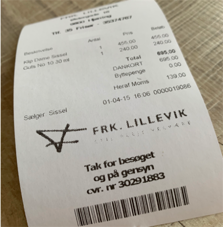 Det gør vi for at vise dig, at når du vælger Frk. Lillevik og en frisør der er medlem af Danmarks Orginisation For Frisører, så følger der et ansvar med. Nemlig at vi får afregnet de ting vi skal, her i blandt moms og skat. Den kassebon, som du får med, er dit bevis for, at din betaling er registreret i kassen og dermed går ind i det store system - DANMARK.